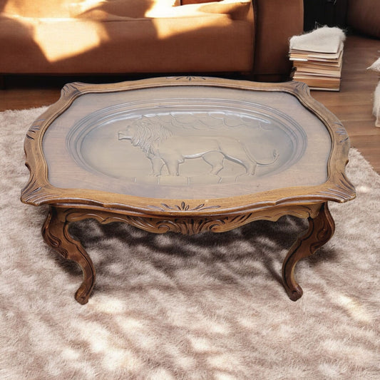 Antique French Walnut Cocktail Table with Wood Carved Lion Motif