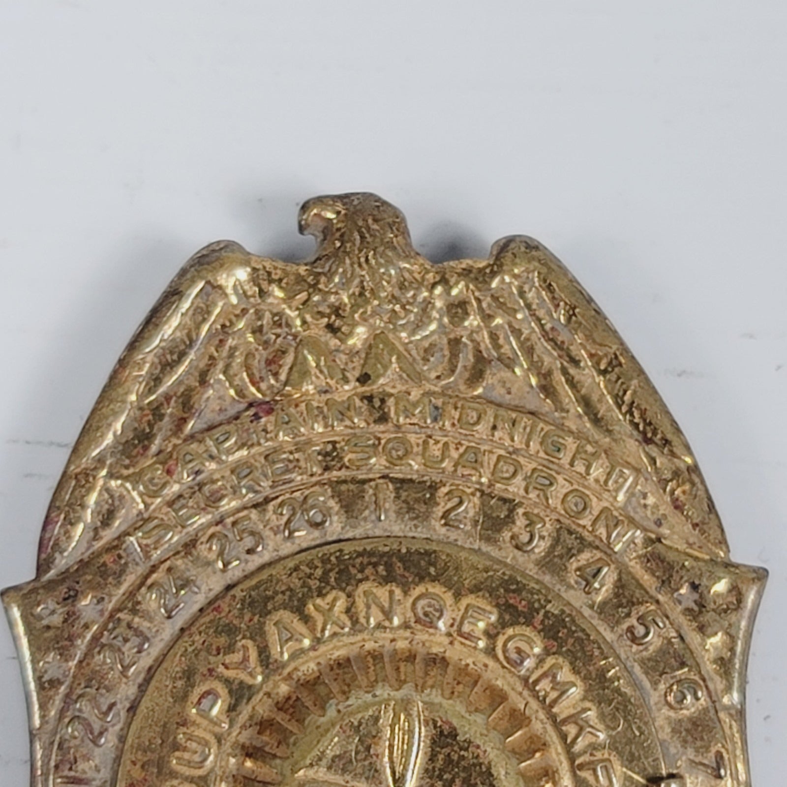 Original 1941 Captain Midnight Decoder Badge, offered as a radio premium from Ovaltine during the golden age of radio. This is the "Mystery Dial Code-O-Graph" version, issued exclusively to members of the Secret Squadron. Made of stamped brass with a movable cipher wheel and pin-back design, it let kids decode secret messages broadcast during the Captain Midnight radio show.