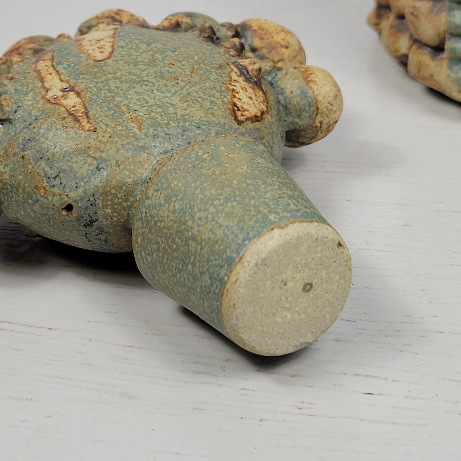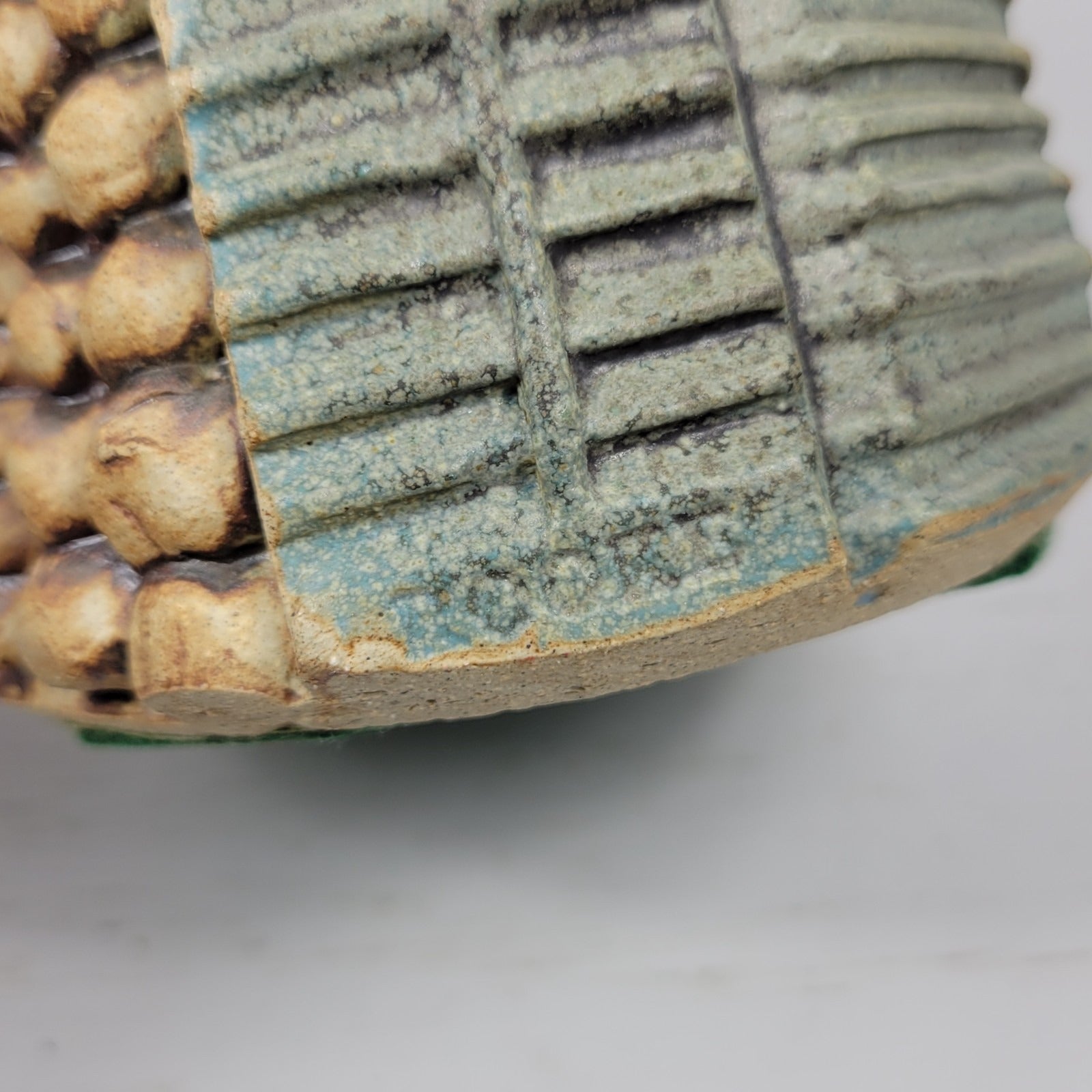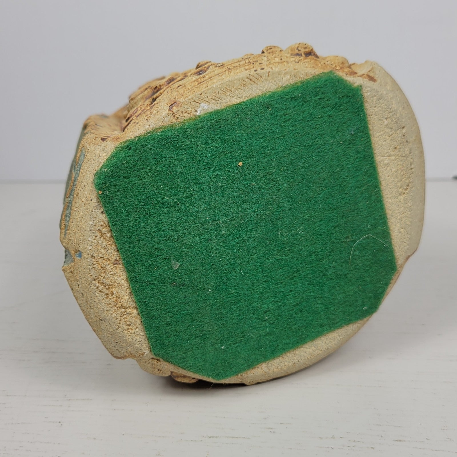 This is a decanter signed by artist Bernard Rooke. This vintage mid-century English Brutalist Style Pottery is a unique and collectible piece of decorative pottery. It features a multicolor Brutalist pattern, showcasing the Art pottery production style. It is signed ROOKE near the bottom of the piece and weighs just over 2 lbs. The base measures about 4" x 5" and it is about 9" tall to the top of the stopper. Crafted from clay using pottery techniques, this decanter is a true representation of mid-century English craftsmanship.