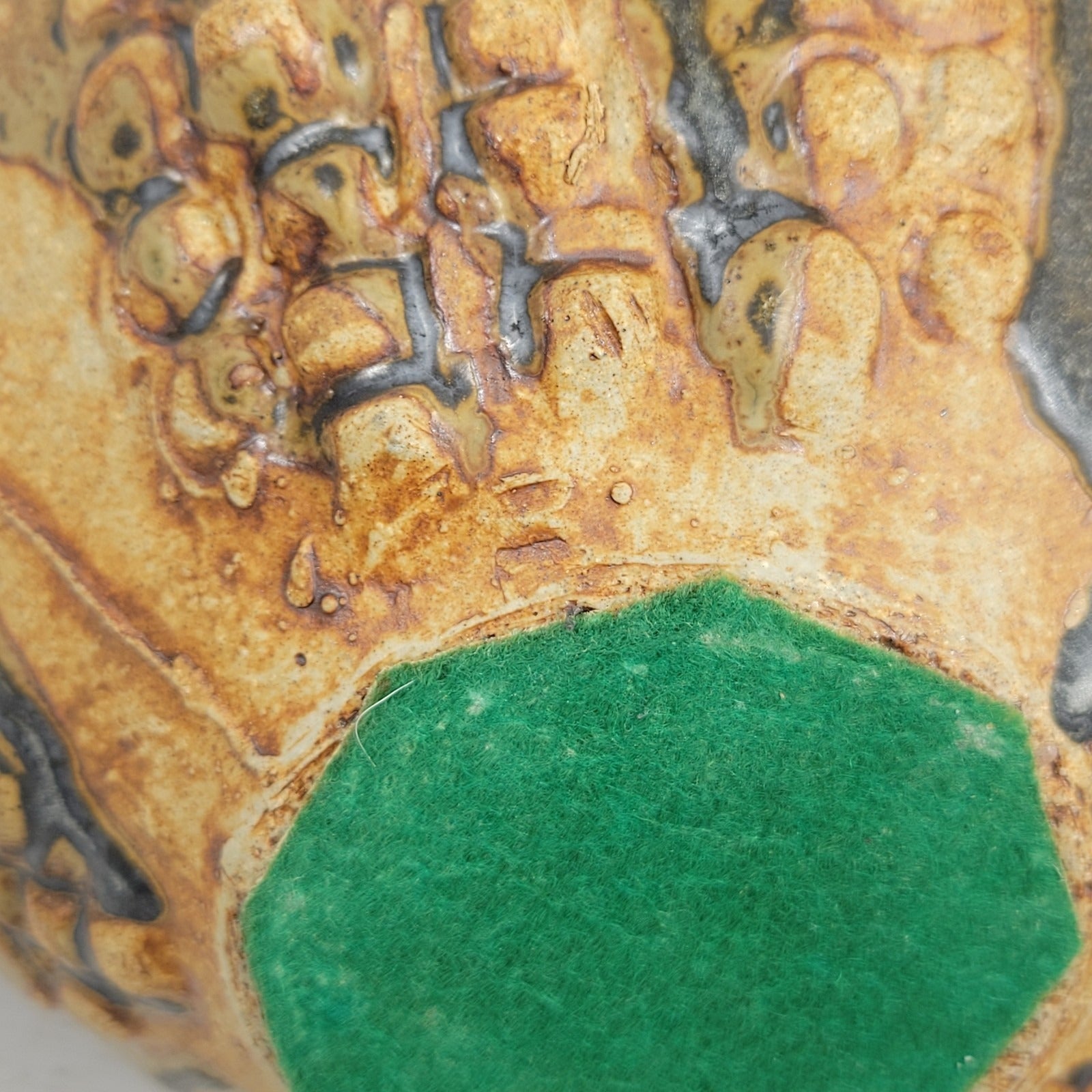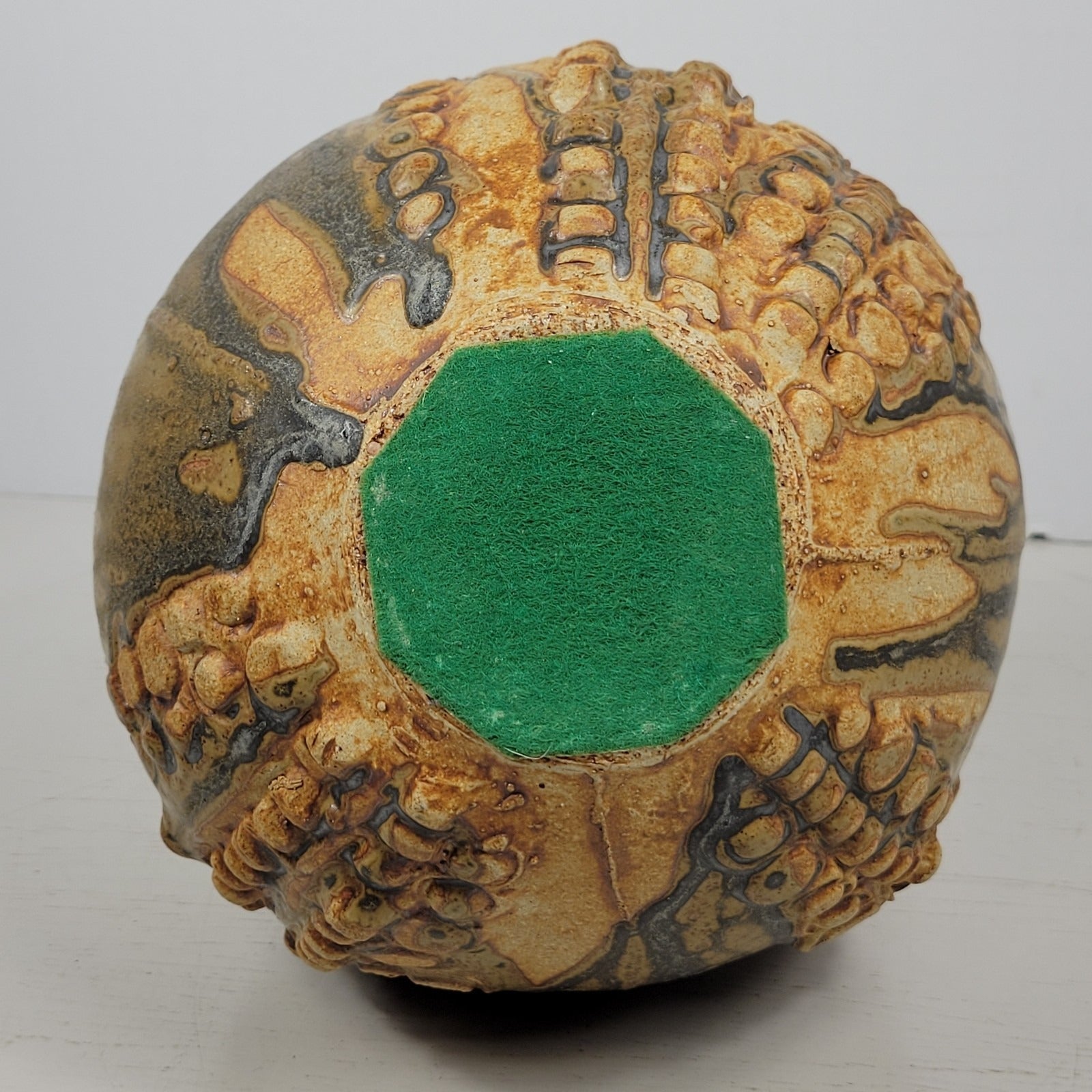 This is a decanter signed by artist Bernard Rooke. This vintage mid-century English Brutalist Style Pottery is a unique and collectible set of decorative pottery. It features a multicolor Brutalist pattern, showcasing the Art pottery production style. It is signed near the bottom of the decanter. The width of the decanter measures about 7" and it is about 12" tall including the stopper. It weighs about 3 lbs 9 oz. Crafted from clay using pottery techniques, this set is a true representation of mid-century English craftsmanship.