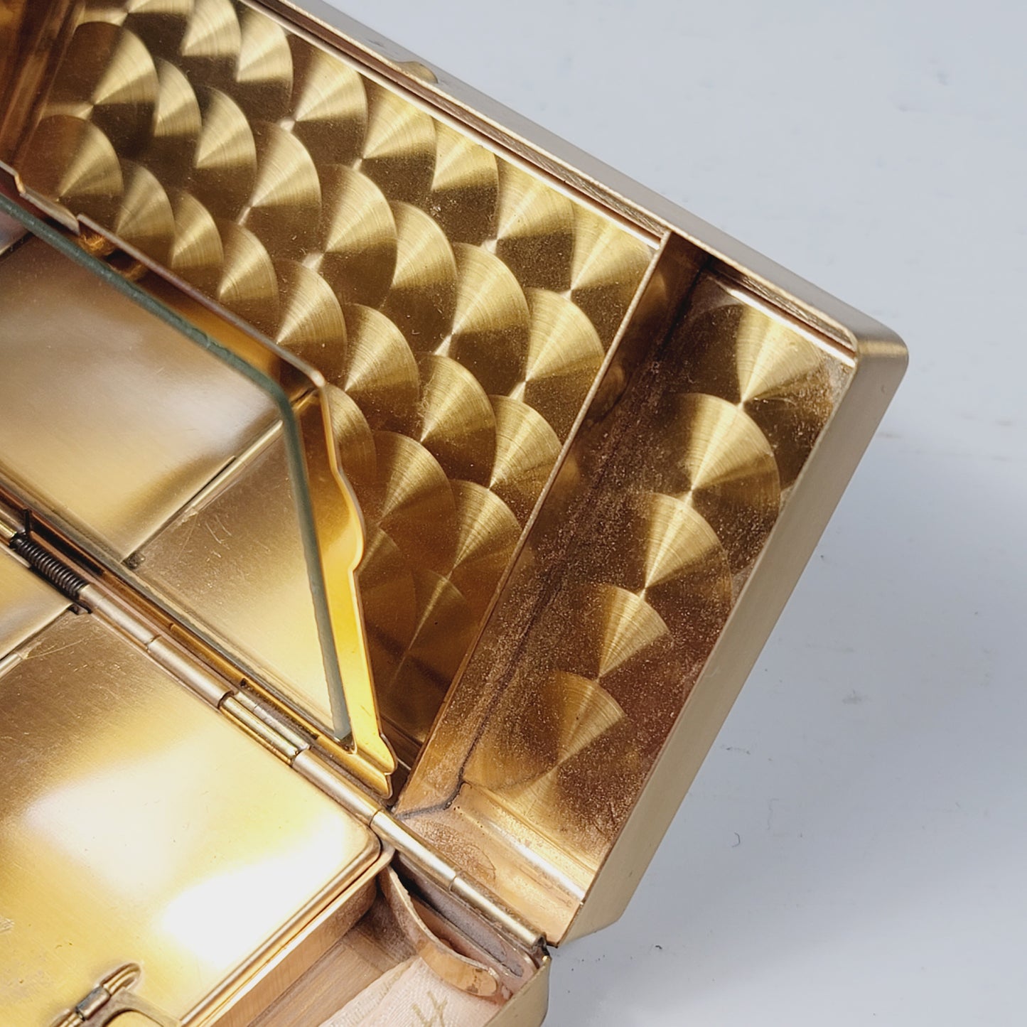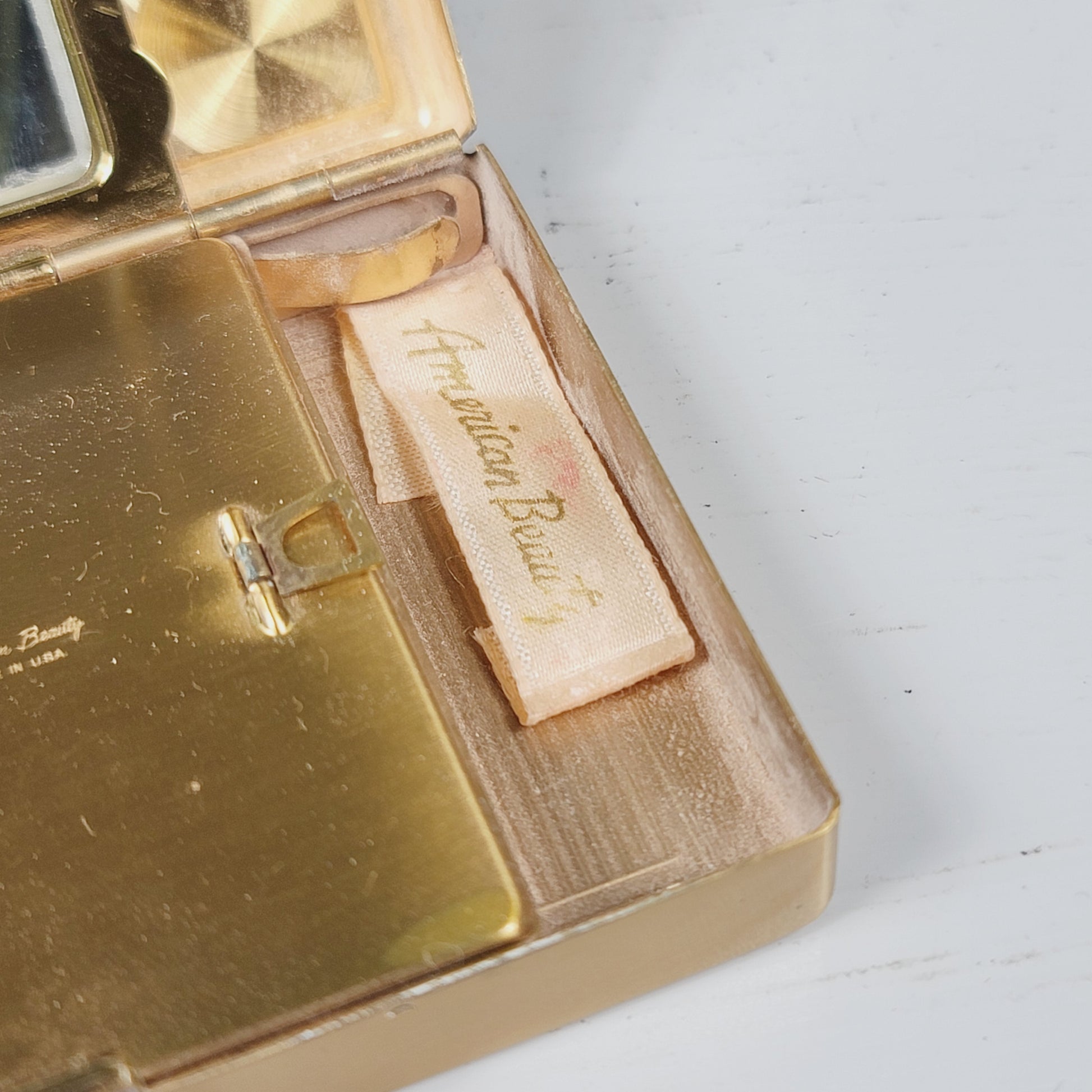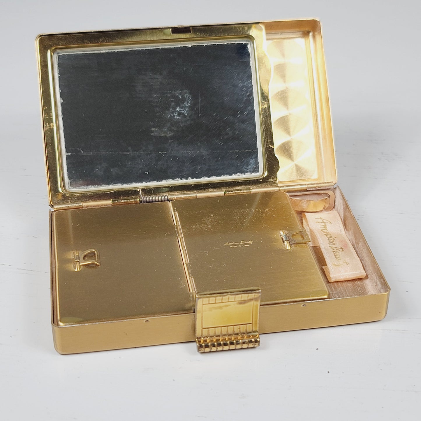 Originally included a matching lipstick holder (not included). The powder compartment still has the original puff, though it’s split on two sides. Exterior condition is excellent with only minimal signs of age.