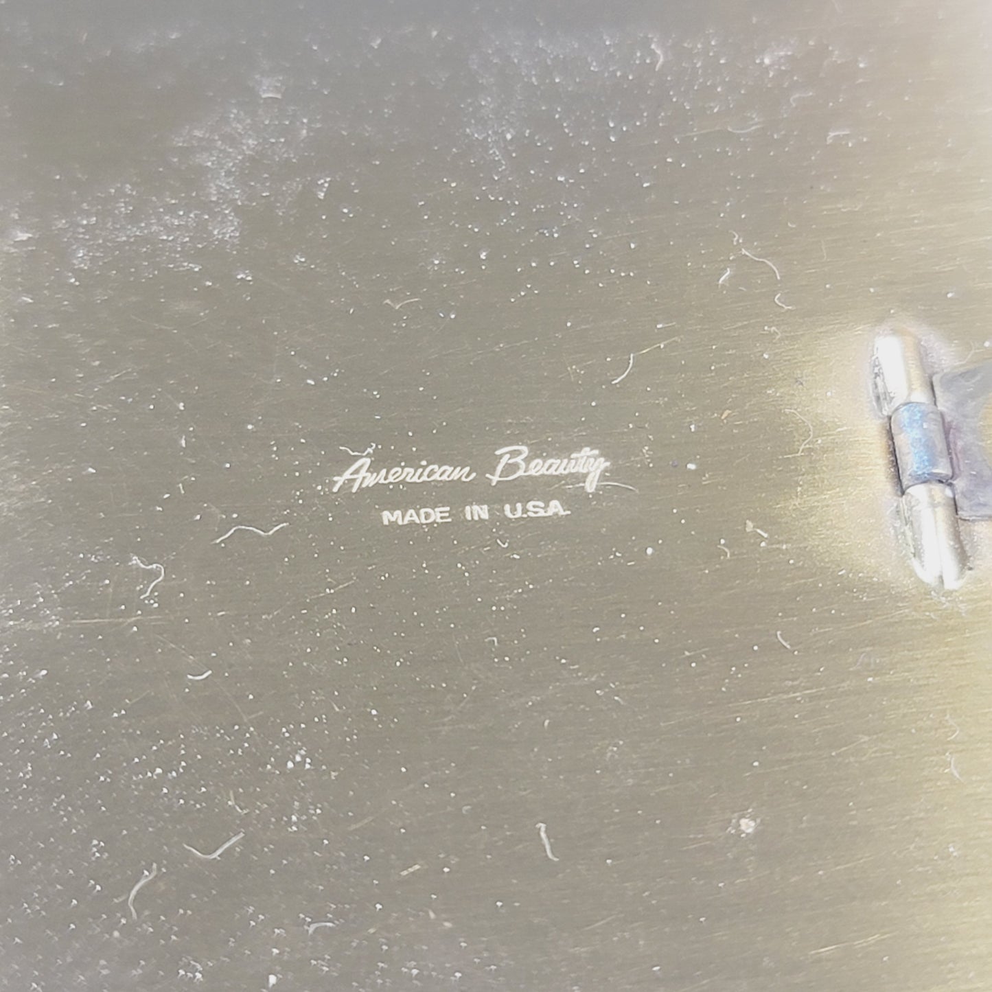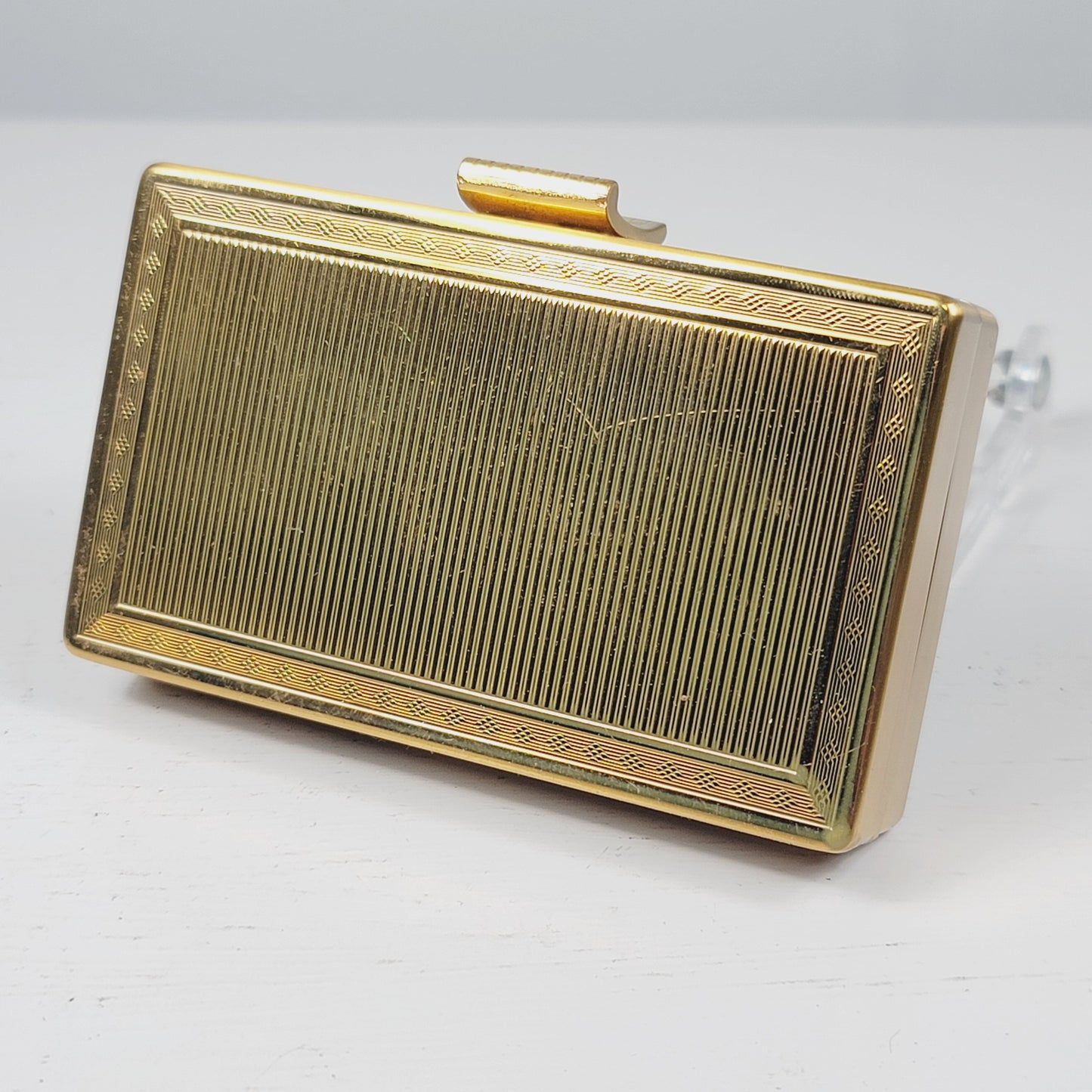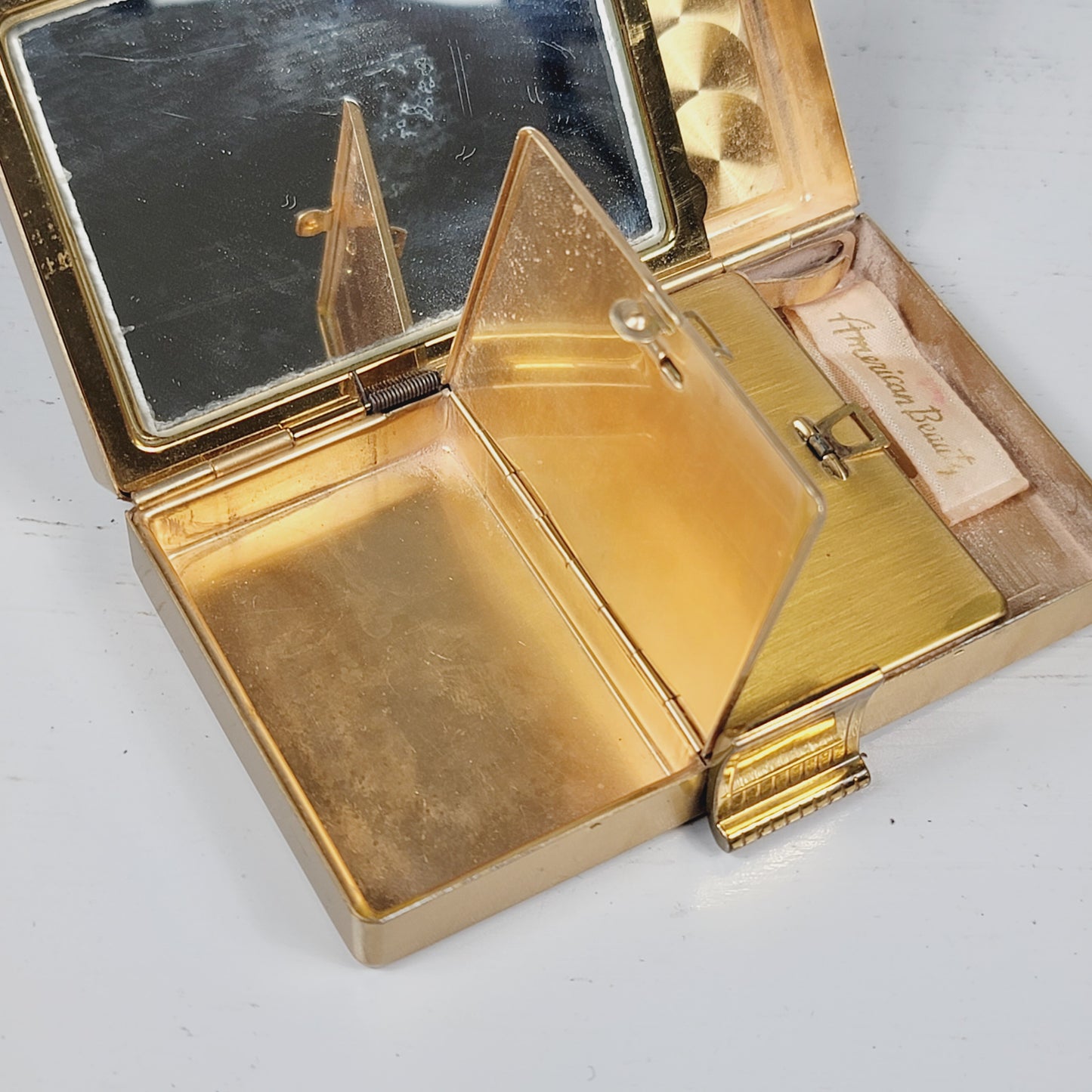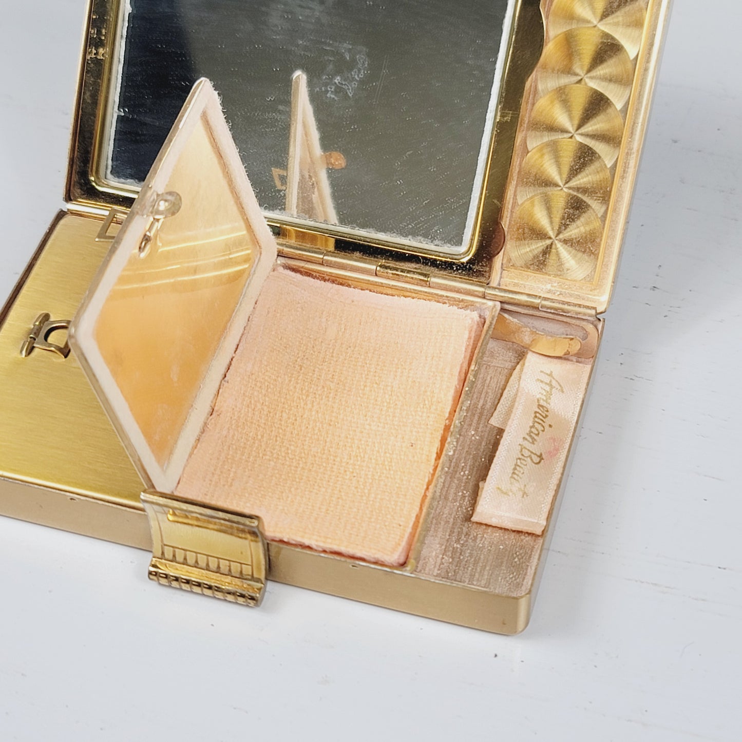Originally included a matching lipstick holder (not included). The powder compartment still has the original puff, though it’s split on two sides. Exterior condition is excellent with only minimal signs of age.
