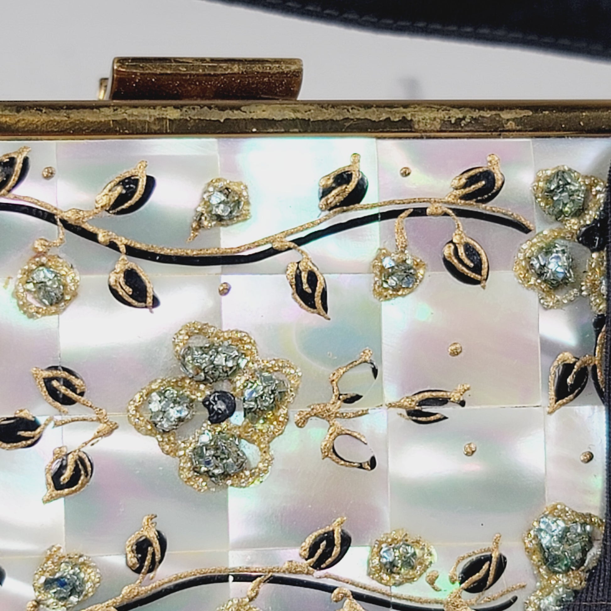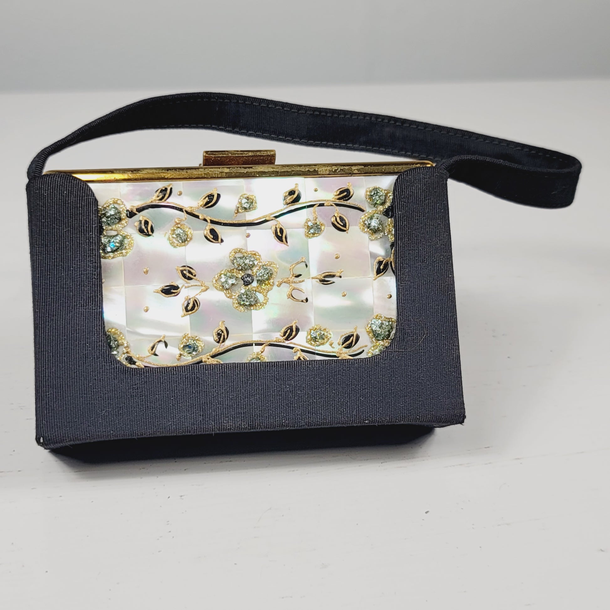 Vintage Elgin American Beauty Mother of Pearl Compact Clutch Purse – Black Grosgrain