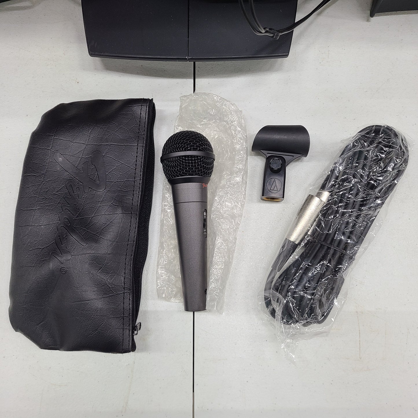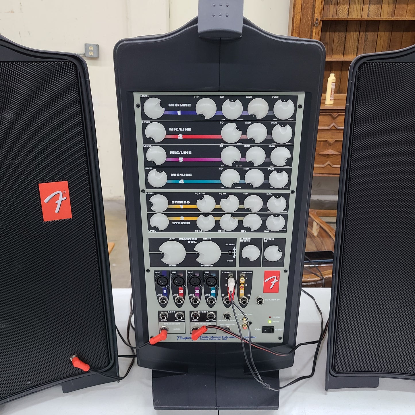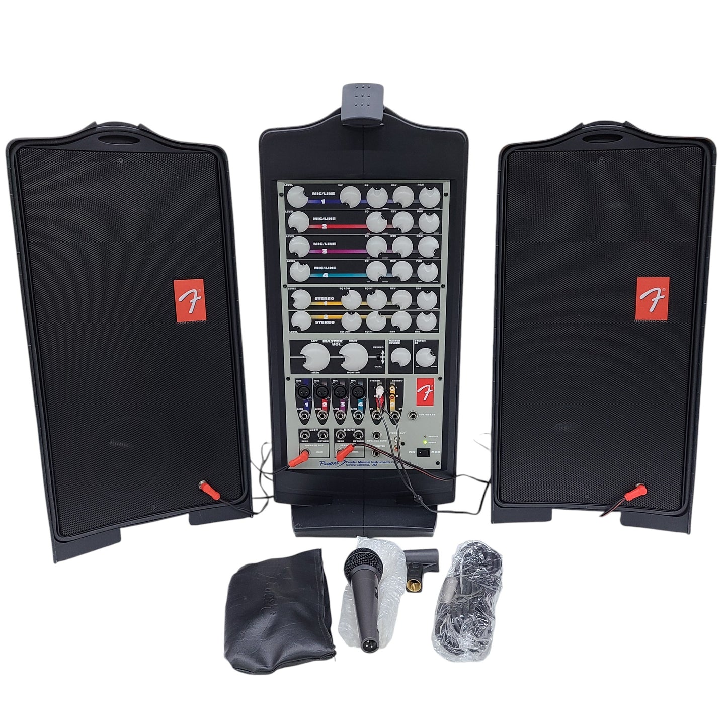 Includes one fender p-51 microphone, one microphone cable and stand clip, two speaker wires, one power cord with storage pouch and original box. System is tested and working great.