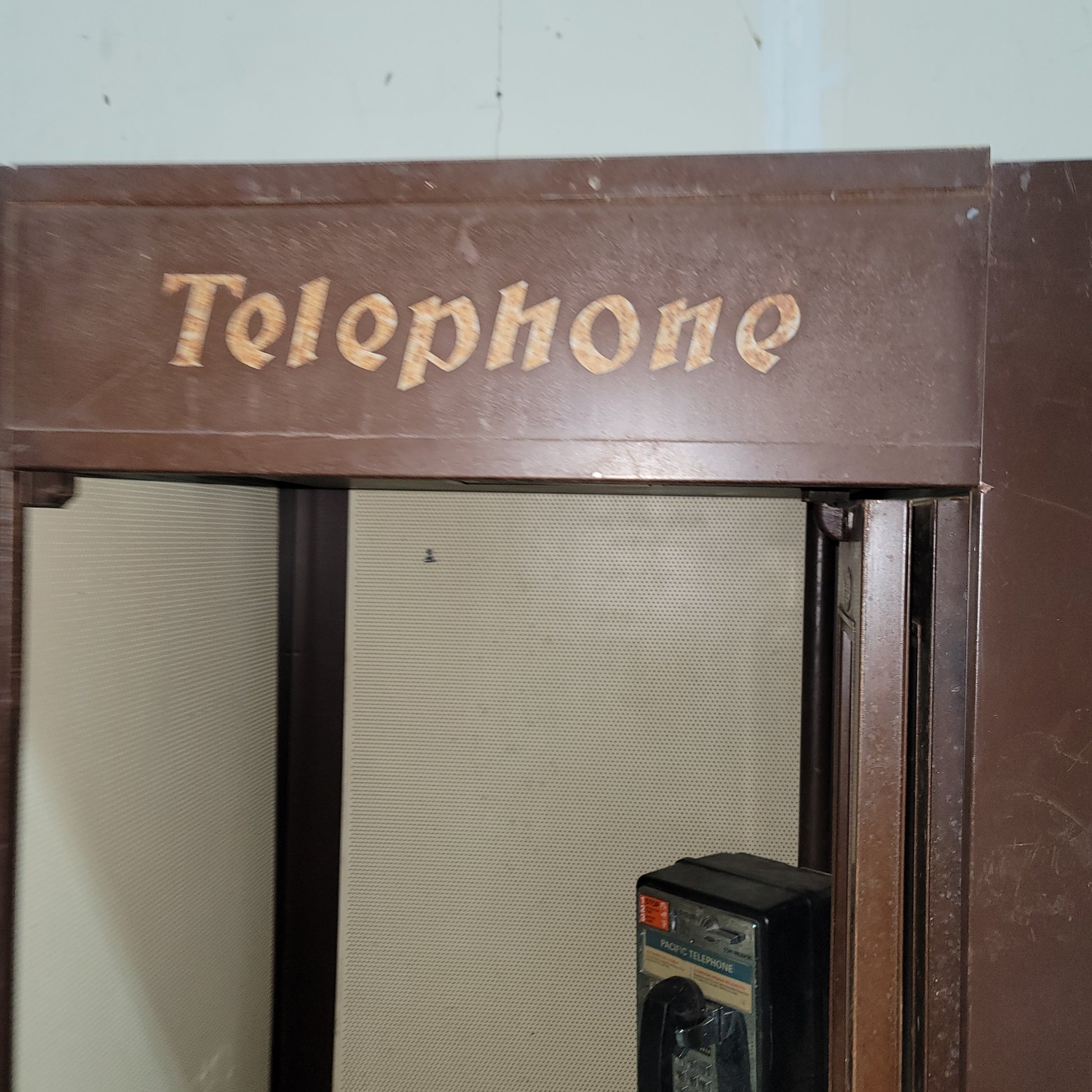 Based on construction and design, this example likely dates to the late 1940's to early 1950's. The phone is more likely 70's-80's. Booth measures approximately 84" tall x 30" wide x 30" deep.
