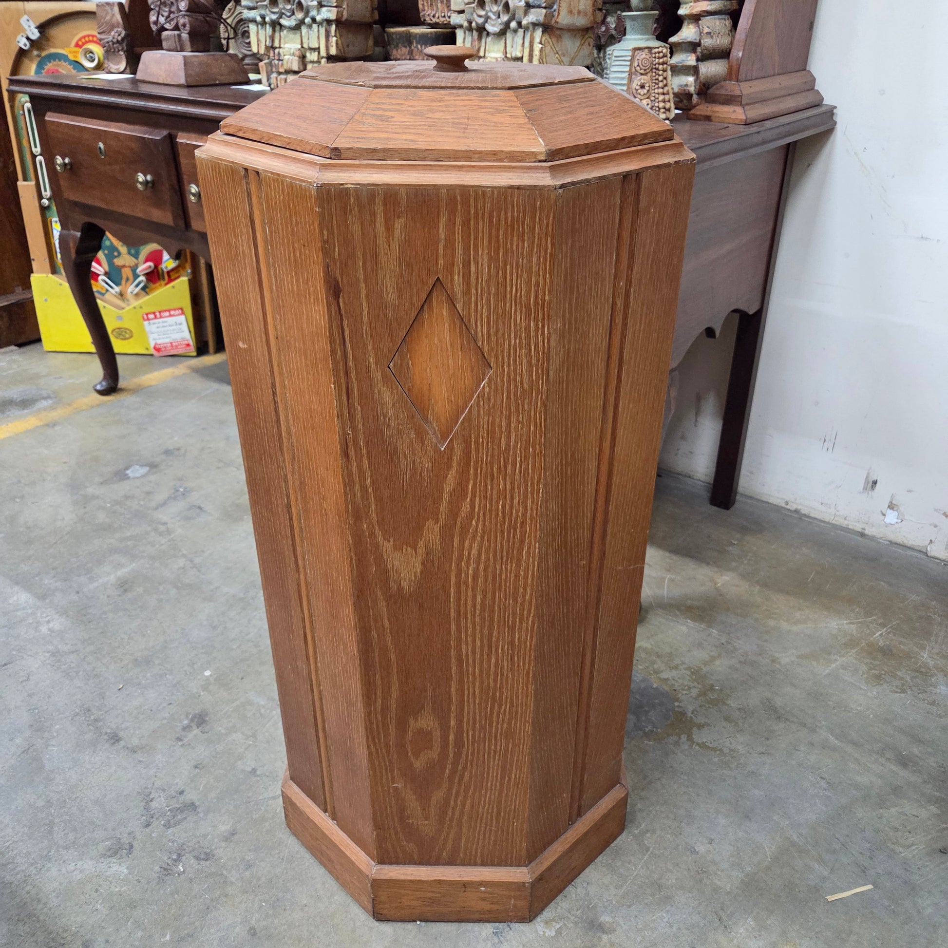 Octagonal holy water font crafted from oak, featuring diamond-shaped decorative inlays. Measures 39" tall with an 18" diameter. Missing Bowl