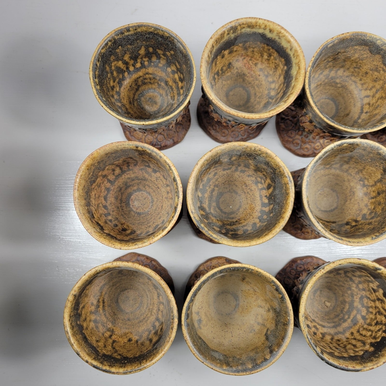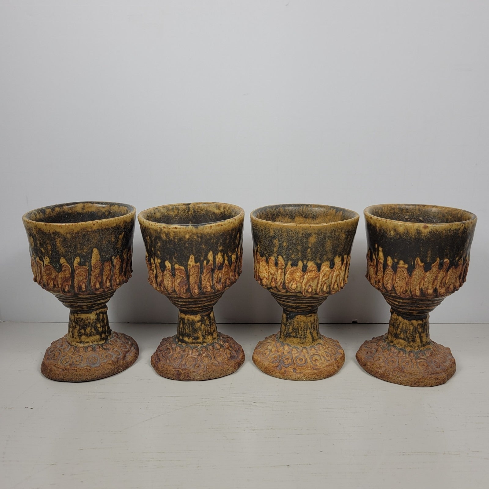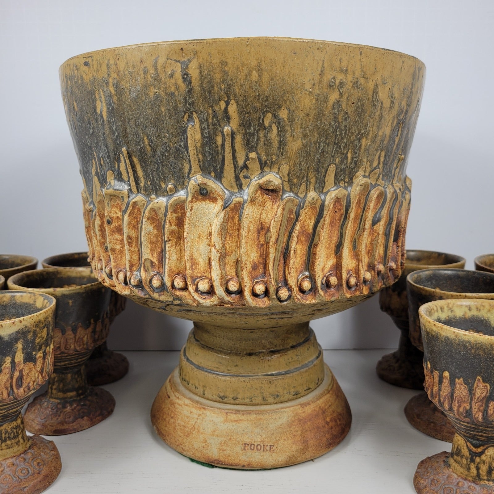 This is a punch bowl with 12 goblets signed by artist Bernard Rooke. This vintage mid-century English Brutalist Style Pottery is a unique and collectible set of decorative pottery. It features a multicolor Brutalist pattern, showcasing the Art pottery production style. It is signed ROOKE near the bottom of the pedestal bowl. The diameter across the top of the bowl measures about 11" and it is about 11" tall. It weighs about 11 lbs 12 oz. Each of the goblets weighs about 12 oz and is 4 7/8" tall. Crafted from clay using pottery techniques, this set is a true representation of mid-century English craftsmanship.
