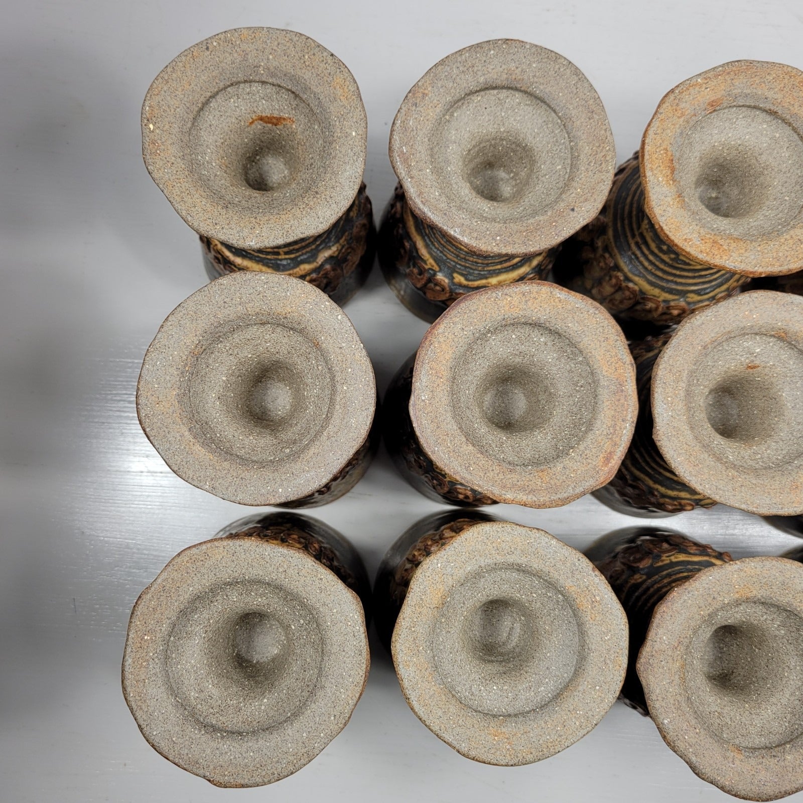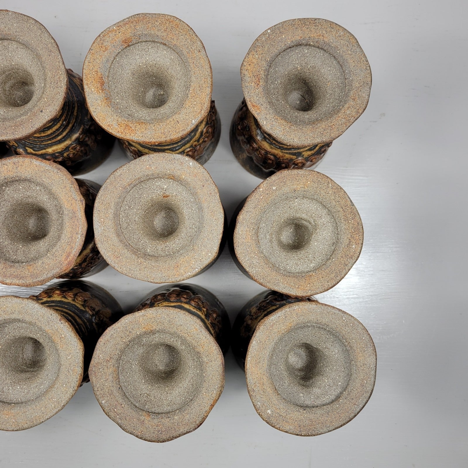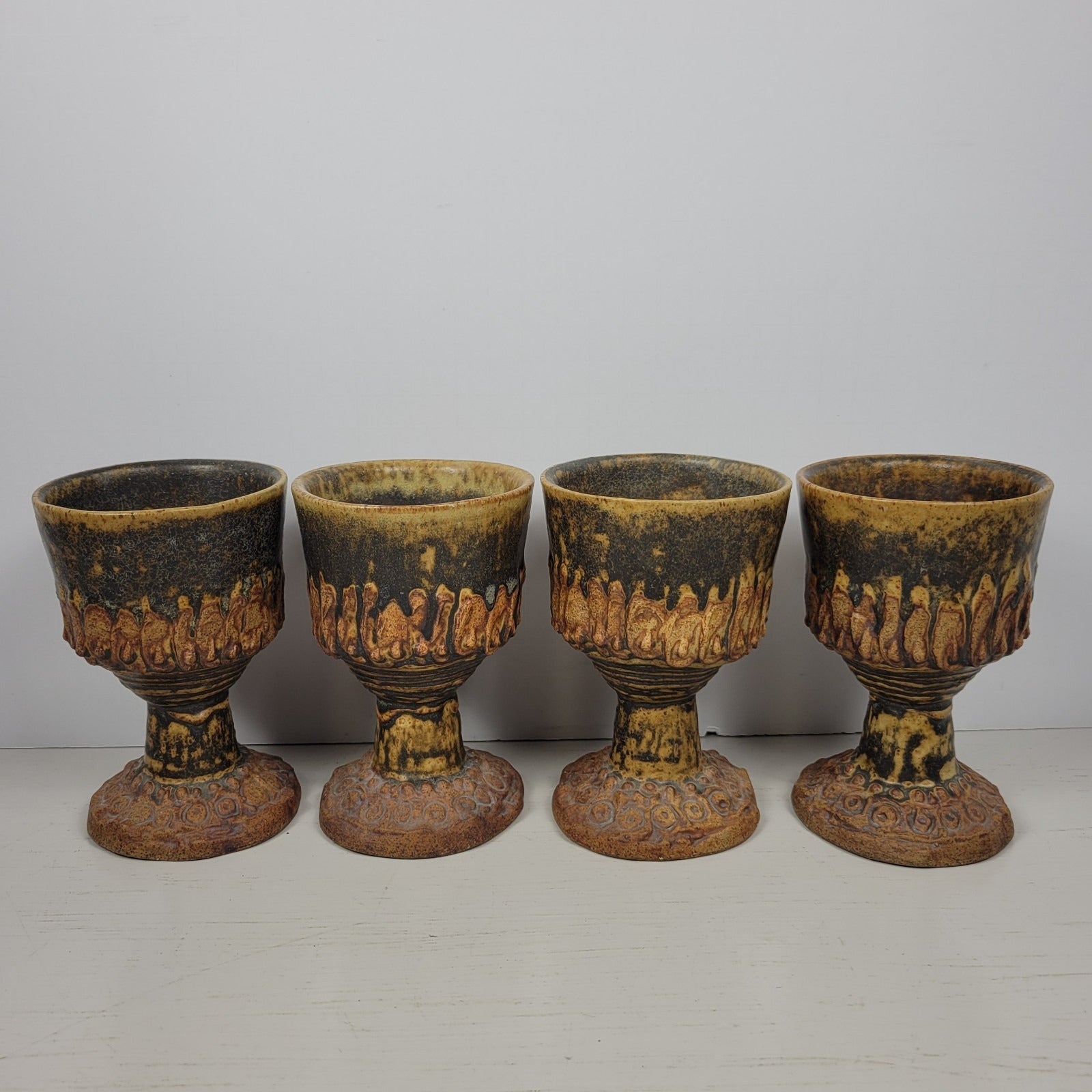 This is a punch bowl with 12 goblets signed by artist Bernard Rooke. This vintage mid-century English Brutalist Style Pottery is a unique and collectible set of decorative pottery. It features a multicolor Brutalist pattern, showcasing the Art pottery production style. It is signed ROOKE near the bottom of the pedestal bowl. The diameter across the top of the bowl measures about 11" and it is about 11" tall. It weighs about 11 lbs 12 oz. Each of the goblets weighs about 12 oz and is 4 7/8" tall. Crafted from clay using pottery techniques, this set is a true representation of mid-century English craftsmanship.