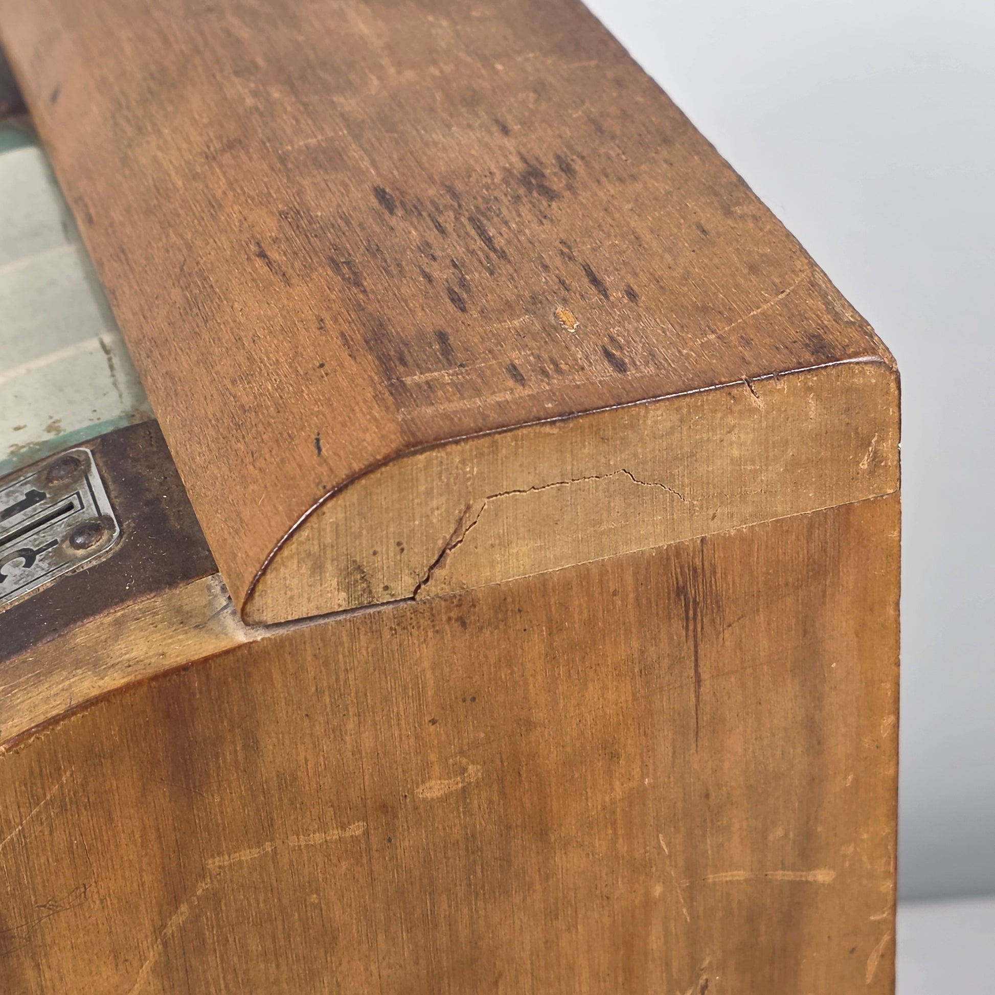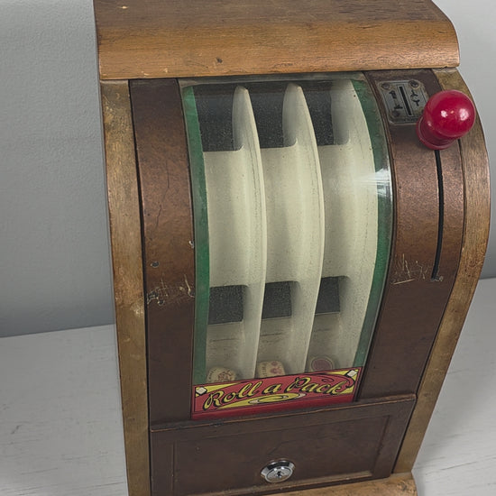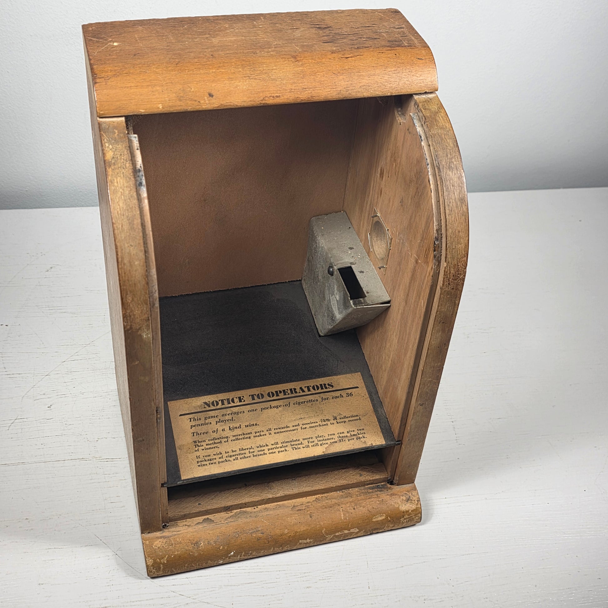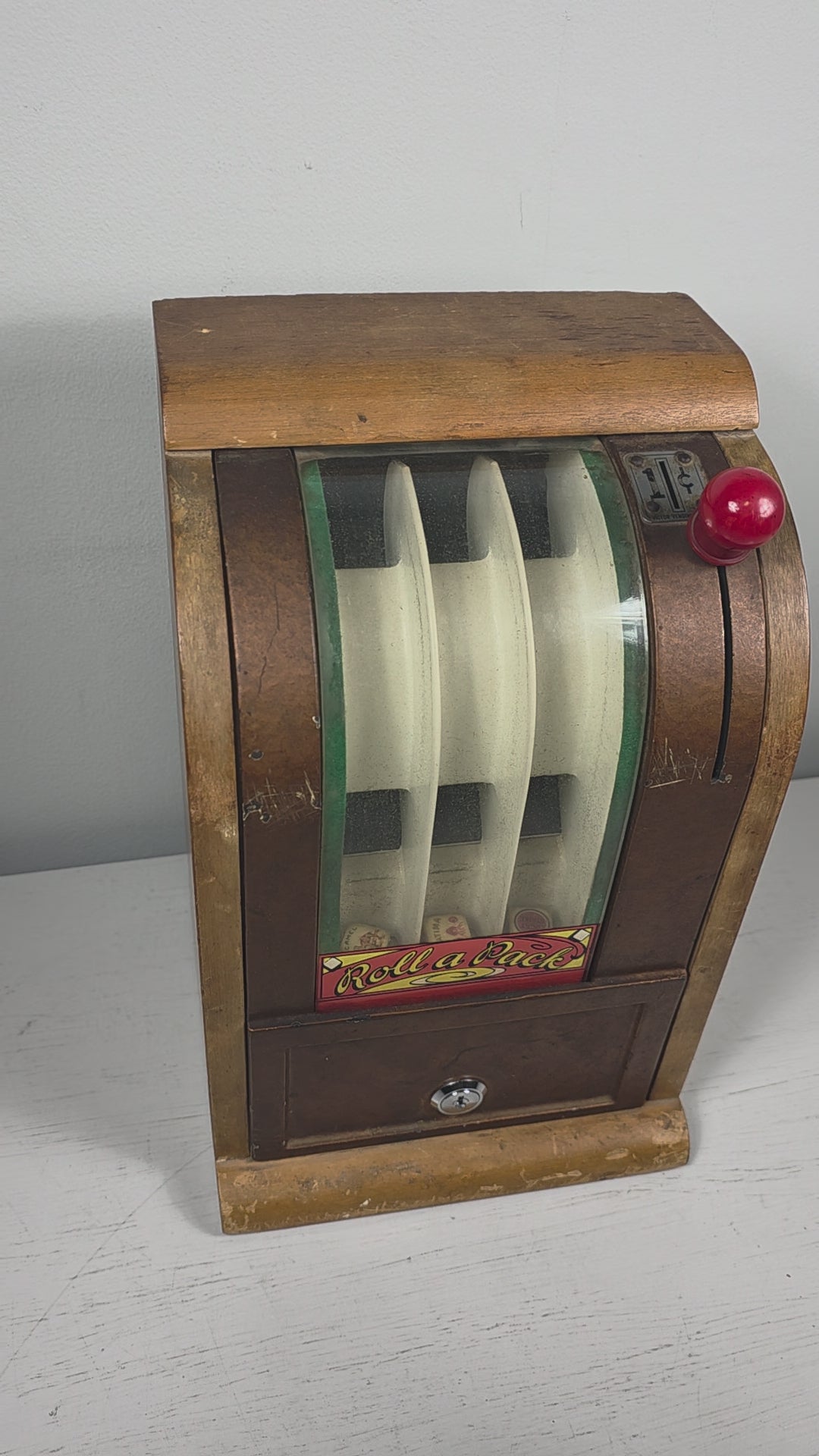 Offered is a rare original Victor “Roll a Pack” 1¢ countertop trade stimulator. Period trade advertising describes “Roll A Pack” as a counter cigarette dice game with “reel action” and a solid natural birch cabinet, marketed by Victor in 1941 in Chicago. The machine measures 12" tall, 7" wide and 7.5" deep.