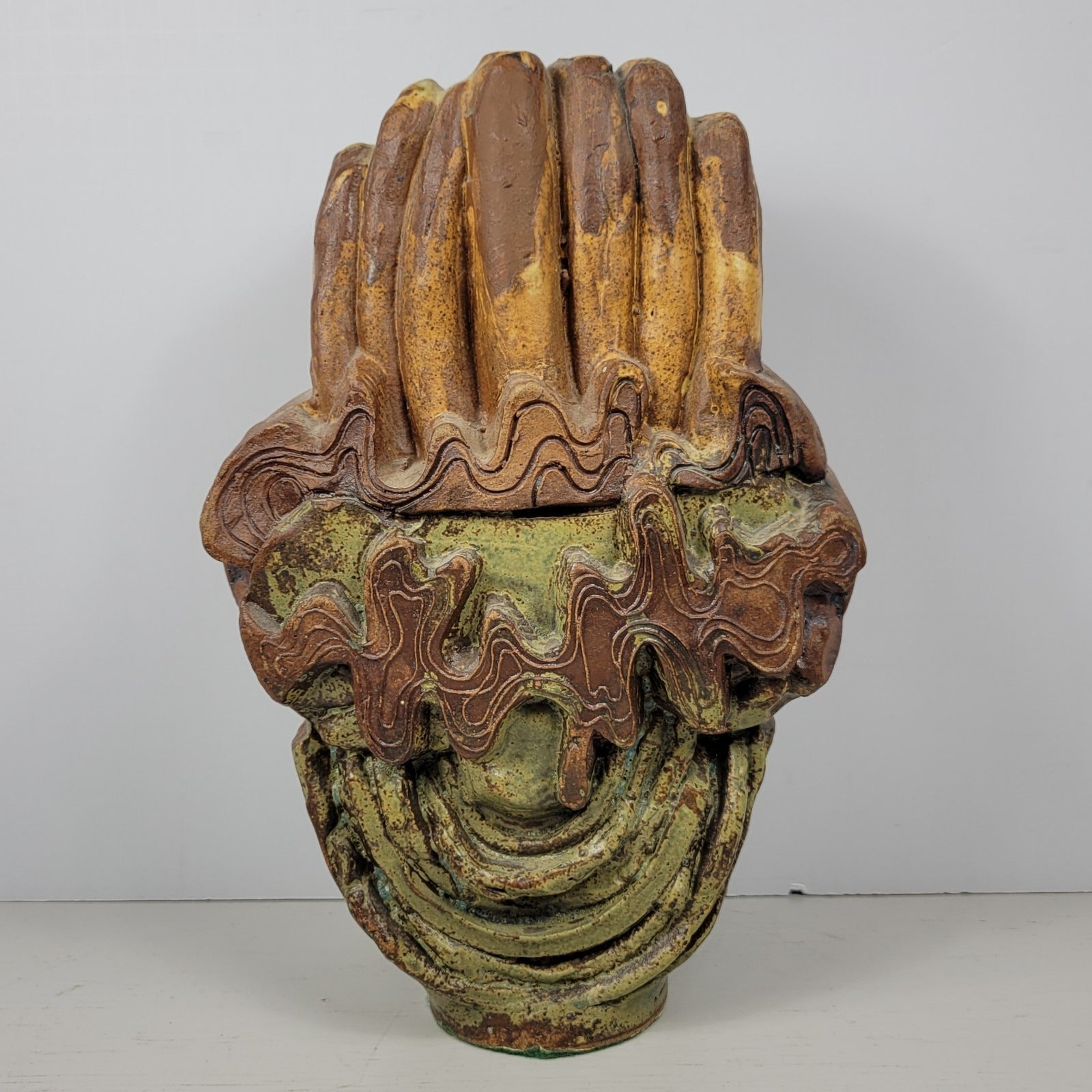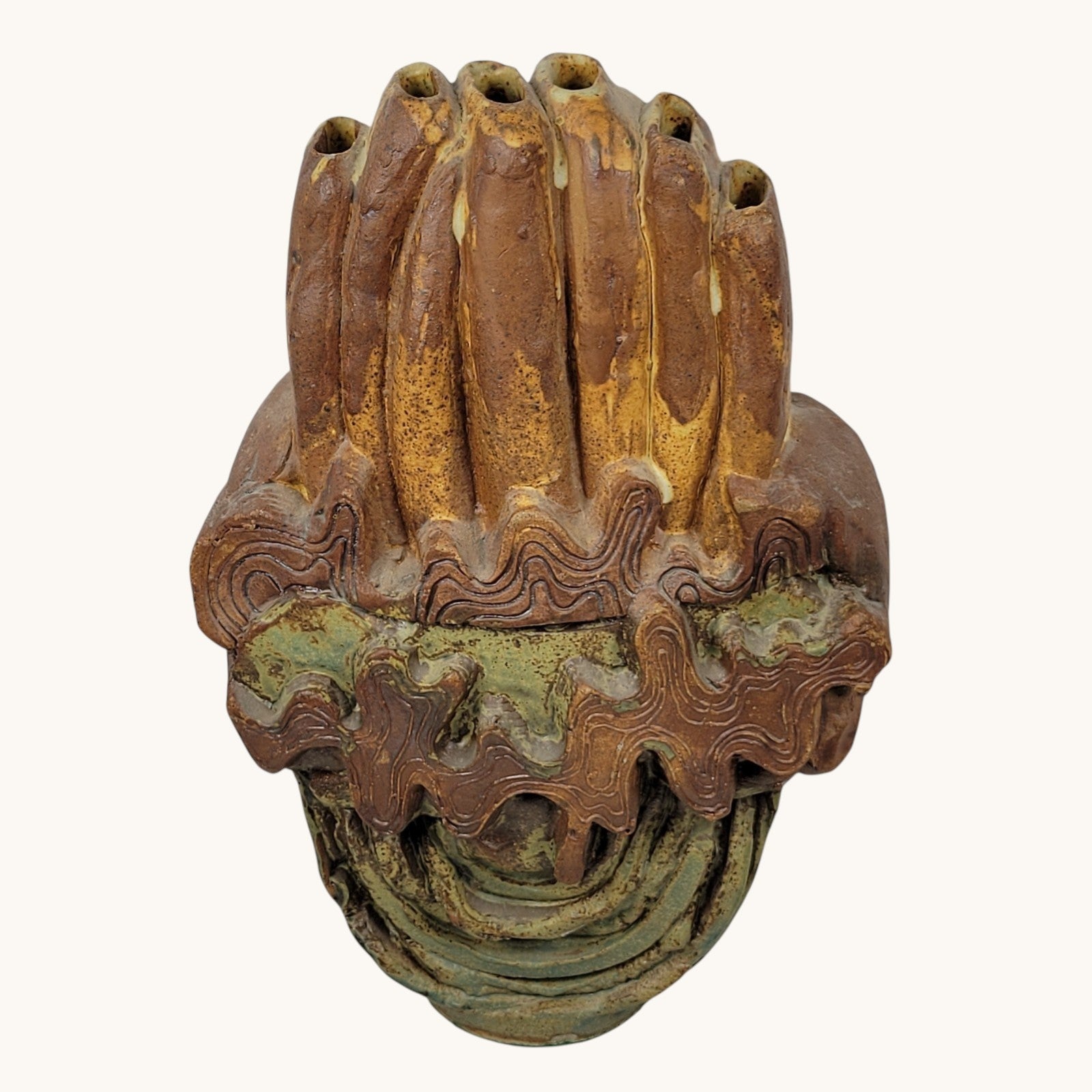 This is a 6 holed vase by artist Bernard Rooke. This vintage mid-century English Brutalist Style Pottery is a unique and collectible piece of decorative pottery. It features a multicolor Brutalist pattern, showcasing the Art pottery production style. It measures about 7 1/2" wide and it is about 11 1/2" tall. Crafted from clay using pottery techniques, this vase is a true representation of mid-century English craftsmanship.