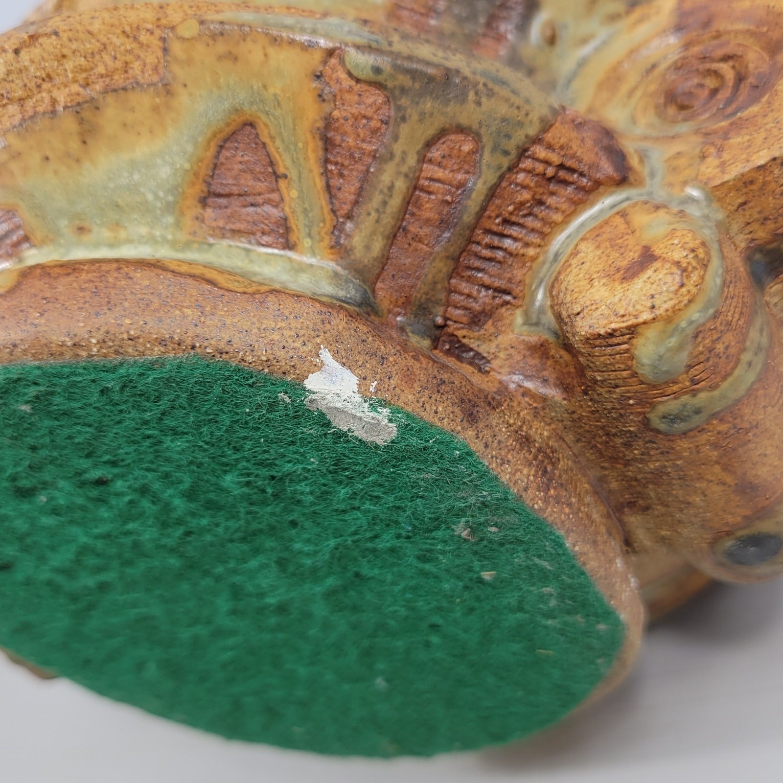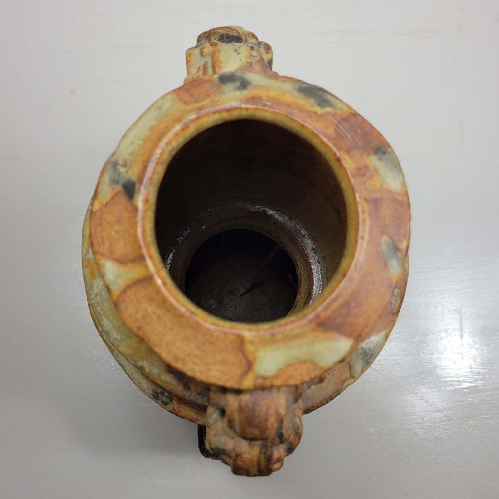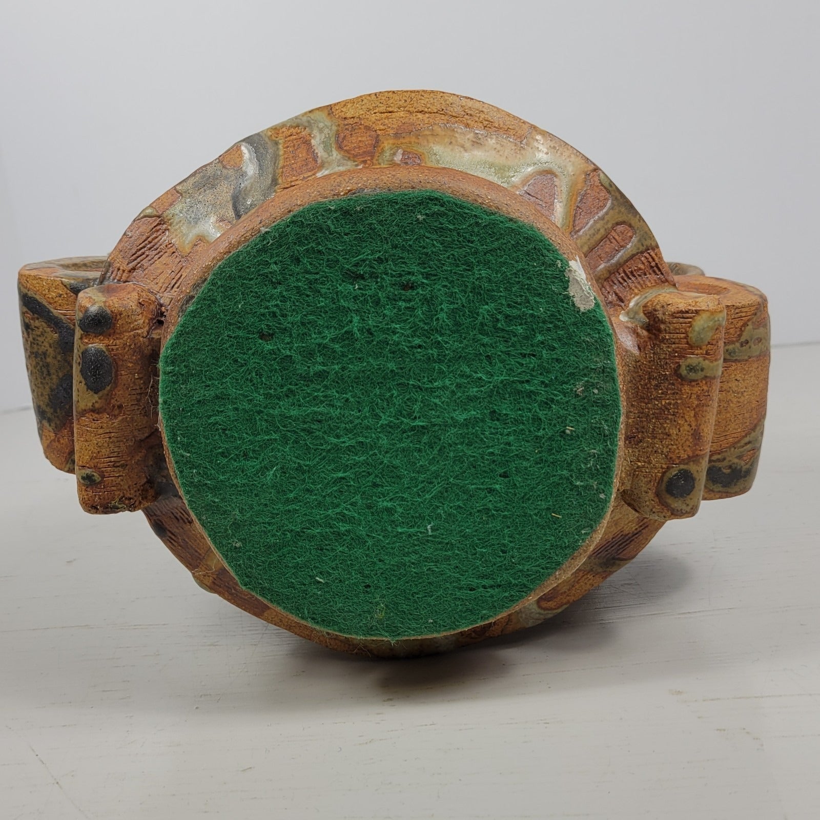 This is a vase by artist Bernard Rooke. This vintage mid-century English Brutalist Style Pottery is a unique and collectible piece of decorative pottery. It features a multicolor Brutalist pattern, showcasing the Art pottery production style. It measures about 8" wide and it is about 12 1/2" tall. Crafted from clay using pottery techniques, this vase is a true representation of mid-century English craftsmanship.