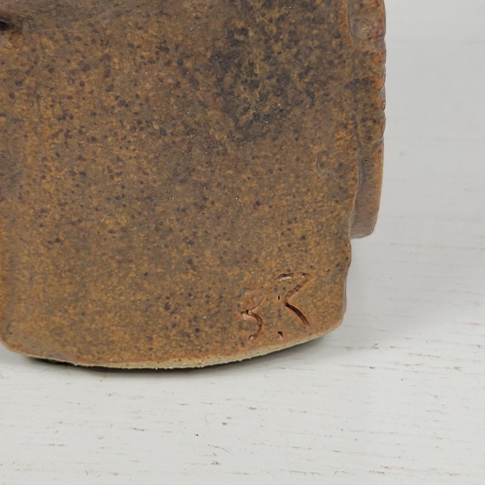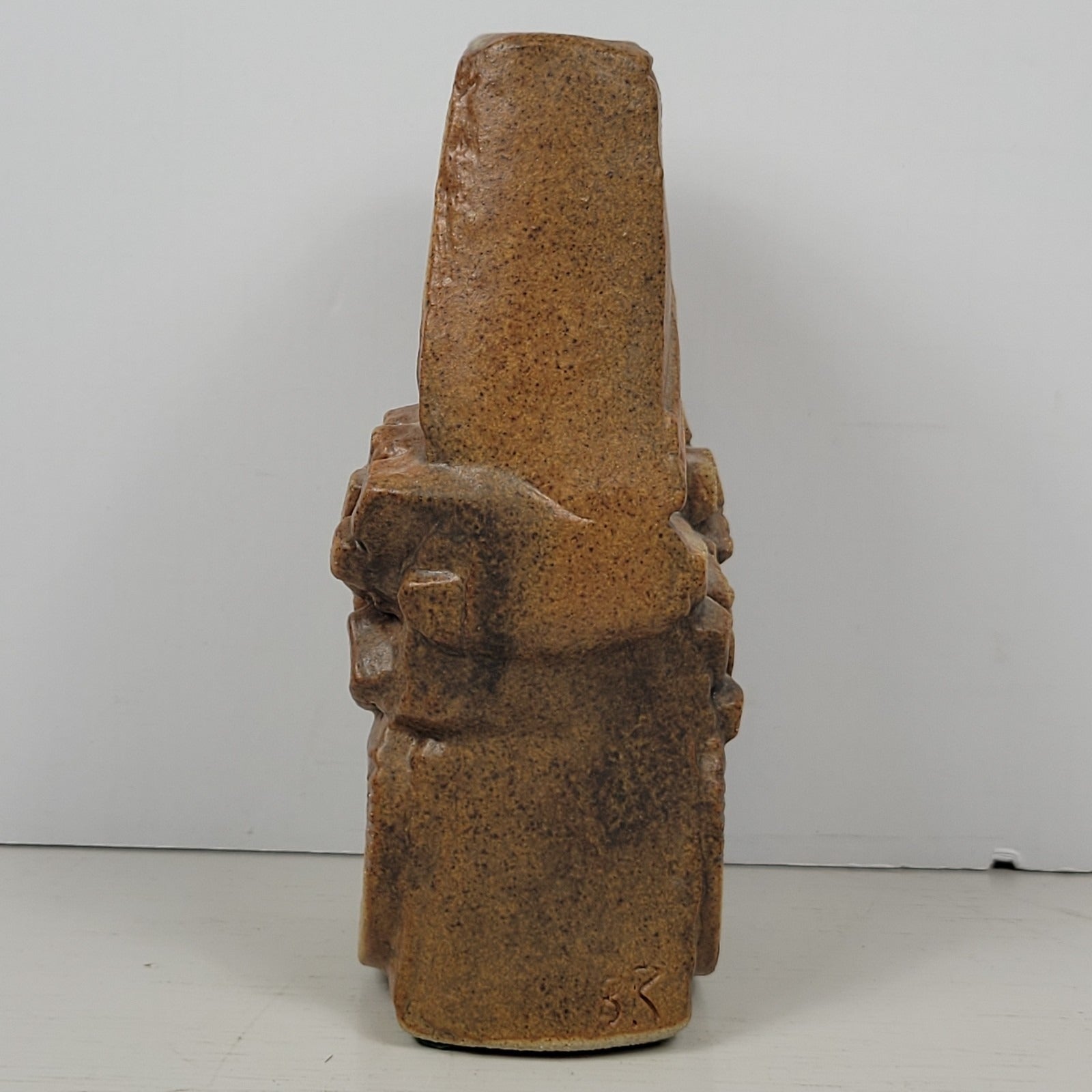 This is a vase signed by artist Bernard Rooke. This vintage mid-century English Brutalist Style Pottery is a unique and collectible piece of decorative pottery. It features a multicolor Brutalist pattern, showcasing the Art pottery production style. It is signed BR near the bottom of the piece. The base measures about 2 1/2" x 3" and it is about 6 1/2" tall. Crafted from clay using pottery techniques, this vase is a true representation of mid-century English craftsmanship.